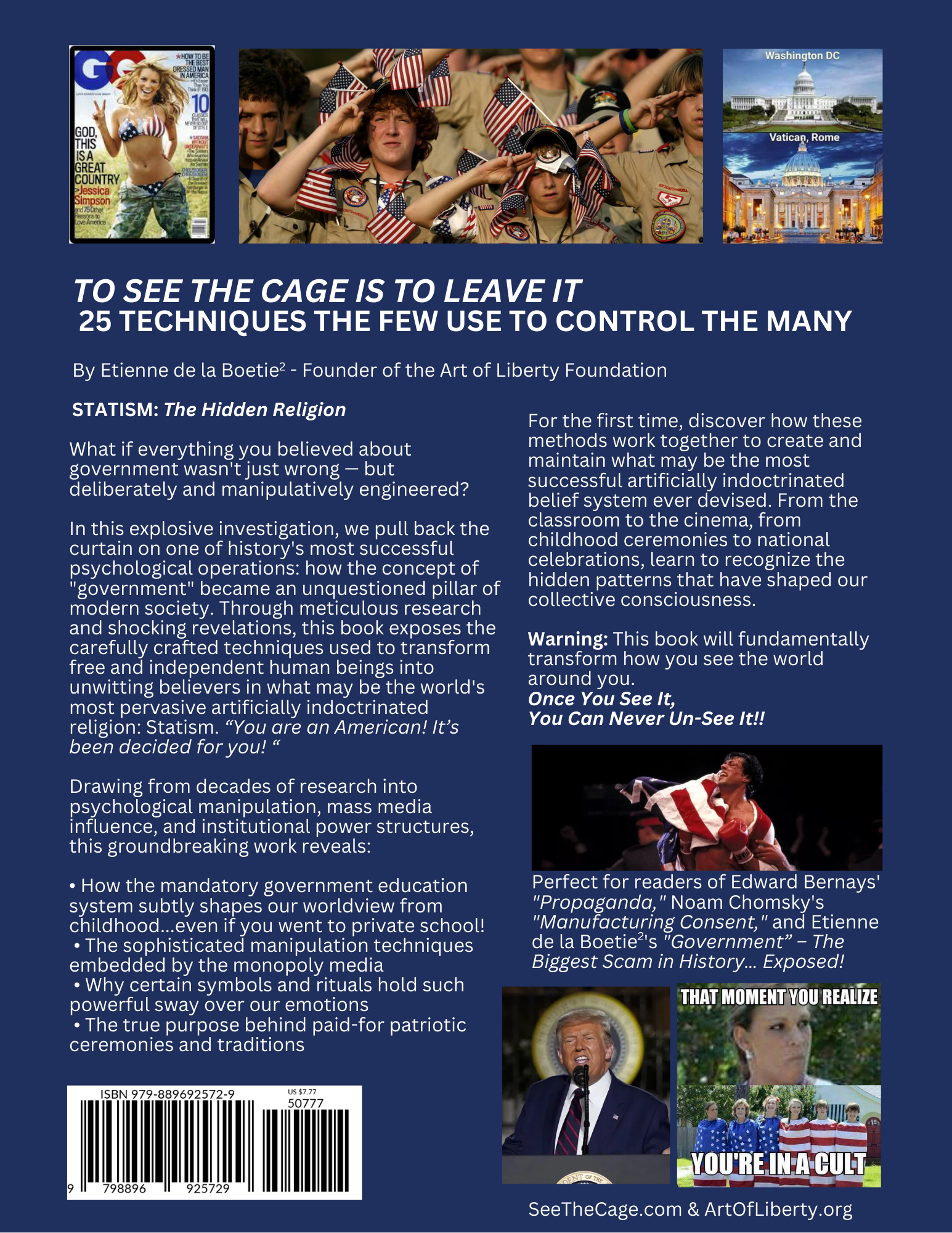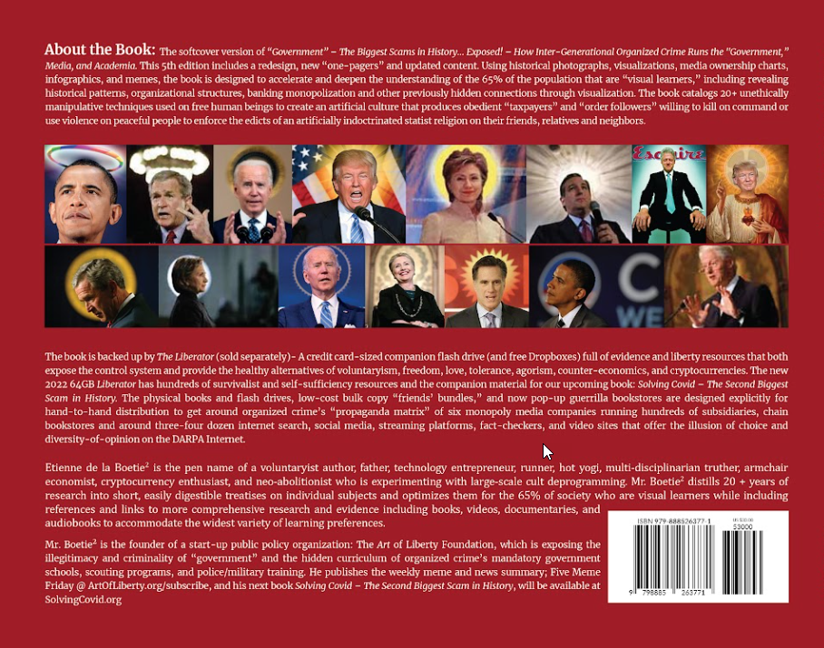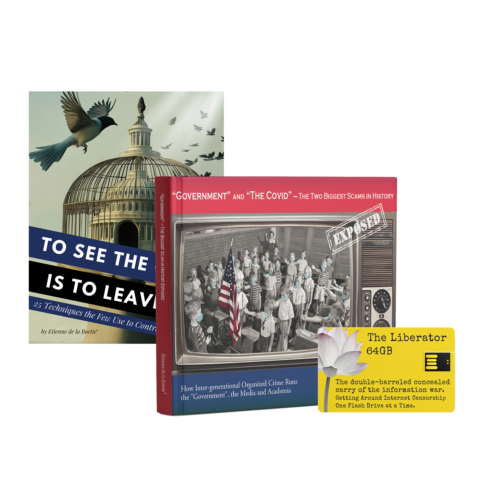 Get a discount when you purchase the high-resolution collector editions of both of Etienne’s books and a 64GB credit card-sized Liberator flash drive. These collector-quality hard cover editions use a different printing process that really makes the visualizations, historical photos and memes pop! These high-quality hard covers look great on a coffee table and are guaranteed to captivate, fascinate and educate your friends & guests in a way that no other books can! The bundle includes a high-resolution hardcover edition of To See the Cage is to Leave It – 25 Techniques the Few Use to Control the Many AND “Government” – The Biggest Scam in History… Exposed! + a 64 GB Liberator Flash Drive that includes the ePub versions of both books and evidence of “government” criminality and corruption that is being censored off the internet. Liberator contents include: Documentaries, short videos, important books in PDF, 1250+ dank liberty memes, and music from the truth movement’s hottest artists.