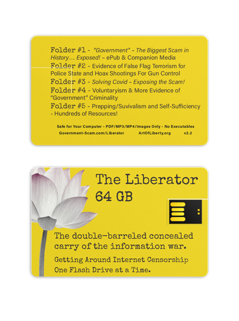 The Liberator is a 64GB credit-card sized, “wafer” flash drive with 64GBs of media backing up the book “Government” – The Biggest Scam in History… Exposed! that includes: