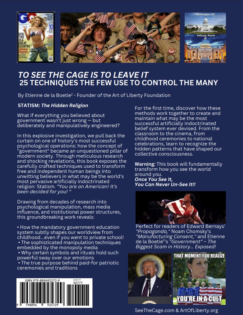 In To See the Cage Is to Leave It, author and truth advocate Etienne de la Boetie2 takes you deep inside the methods and tricks used to manufacture our consent—from the classroom to the newsroom, from the ballot box to the battlefield. This book pulls back the curtain on the world’s most successful mass manipulation: Statism—the indoctrinated, pseudo-religious belief in the desirability, necessity and legitimacy of “government”.