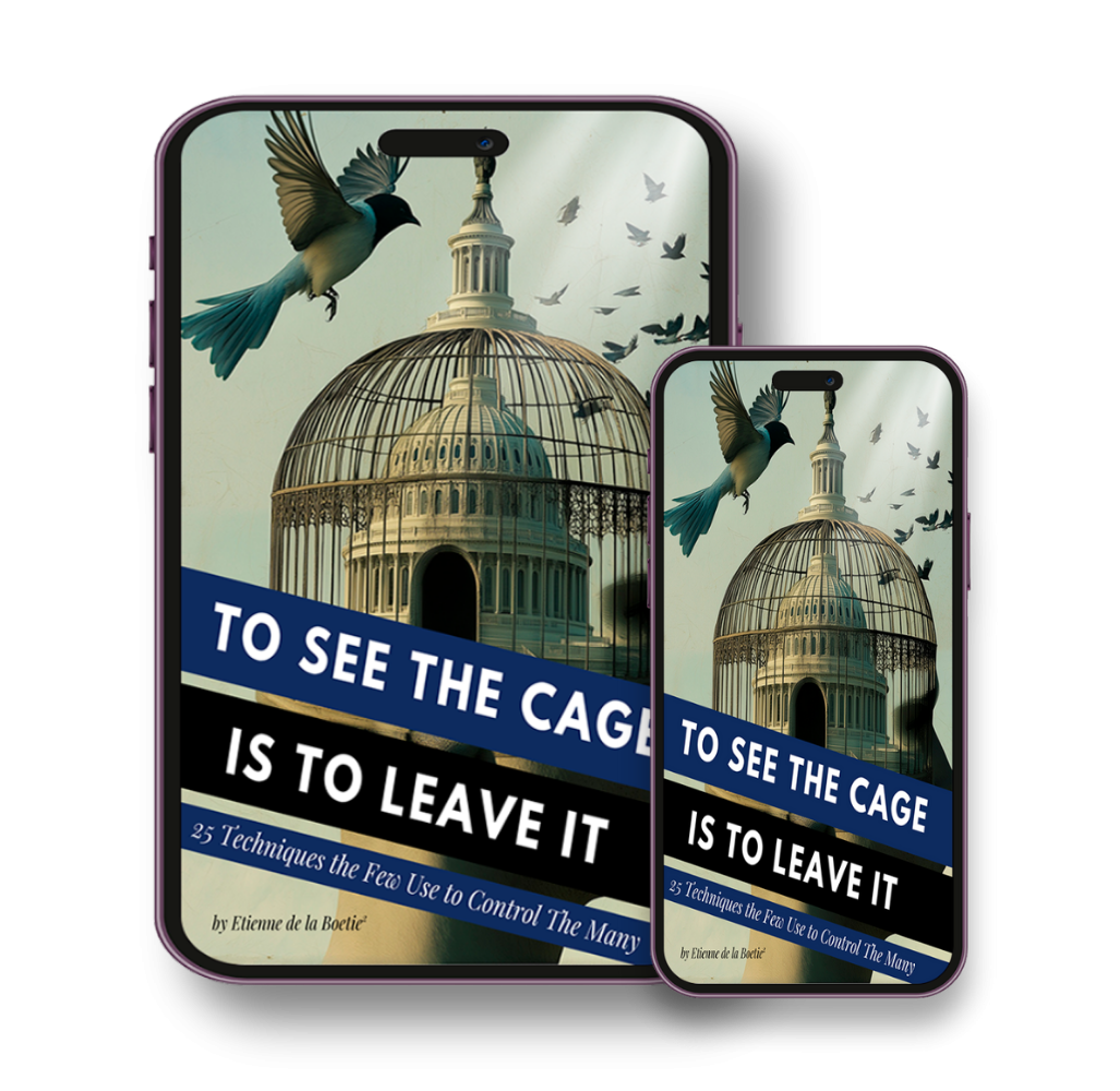 In To See the Cage Is to Leave It, author and truth advocate Etienne de la Boetie2 takes you deep inside the methods and tricks used to manufacture our consent—from the classroom to the newsroom, from the ballot box to the battlefield. This book pulls back the curtain on the world’s most successful mass manipulation: Statism—the indoctrinated, pseudo-religious belief in the desirability, necessity and legitimacy of “government”.