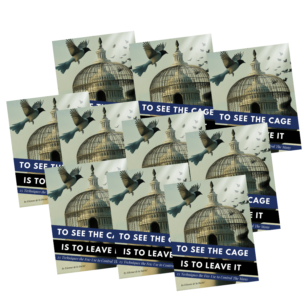 In To See the Cage Is to Leave It, author and truth advocate Etienne de la Boetie2 takes you deep inside the methods and tricks used to manufacture our consent—from the classroom to the newsroom, from the ballot box to the battlefield. This book pulls back the curtain on the world’s most successful mass manipulation: Statism—the indoctrinated, pseudo-religious belief in the desirability, necessity and legitimacy of “government”.
